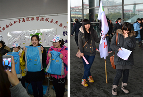 活动当天,志愿者们在接受了漕河泾领导颁发的旗帜后,迎着蒙蒙细雨来到上海南站,进行了环保知识调查并派发环保宣传资料。虽然天公不作美,却未能消减志愿者们投身环保公益的热情;虽然期间会遭到乘客的拒接,也没能阻止志愿者进行环保事业的决心。