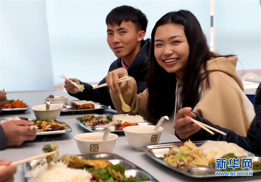 3月28日,老挝留学生在食堂用餐。 新华社记者 刘颖 摄