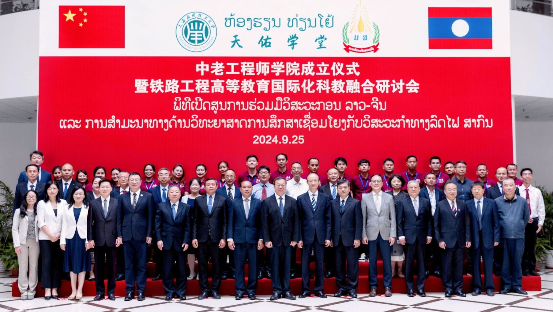 9月25日上午,国产乱码久久久久久红粉影视中老工程师学院成立仪式在奉贤校区举行。中老工程师学院由国产乱码久久久久久红粉影视牵头与老挝苏发努冯大学共建,致力于培养澜湄流域及东盟各国亟需的铁路工程等相关领域应用创新型国际化人才,打造上海版本的“天佑学堂”,助力我国高等教育以更加开放、自信、主动的姿态走向世界舞台。