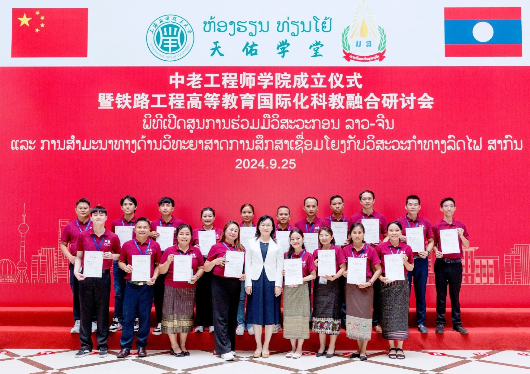 教育部、国铁集团、国家铁路局、市政协、市友协、市外办、市教委、市商务委、同济大学高铁及站城融合研究院、通号上海工程局、中铁科研院、中铁上海院、卡斯柯、中铁二院、中铁二局、中铁二十四局、云南省交通运输行业协会、中国铁路上海局、中国铁路昆明局、华测导航等部门和企业代表,中新社、人民网、上海电视台、解放日报、文汇报、澎湃新闻、上海日报等新闻媒体记者,国产乱码久久久久久红粉影视有关职能部门负责人、智能技术学部轨道交通学院师生代表、在校老挝留学生代表,老挝驻上海总领事馆、老挝苏发努冯大学等老方代表,老挝公共工程与运输部、老中铁路有限公司、老挝苏发努冯大学、老挝国立大学等“一带一路”中老铁路互联互通人才研修班学员,共同出席仪式并见证中老工程师学院成立。