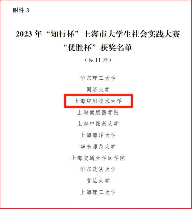 近日,由团市委、市委宣传部、市教卫工作党委、市教委、市精神文明办、市人大社会委、市政协社法委、市学联联合开展的2023年“知行杯”上海市大学生社会实践大赛获奖名单正式公布,我校再次荣获“知行杯”上海市大学生社会实践大赛“优胜杯”(全市仅11个),其中上海市特等奖1项、一等奖1项、二等奖4项、三等奖3项;7名教师获上海市优秀指导教师;2名学生获上海市先进个人,创历史最好成绩。